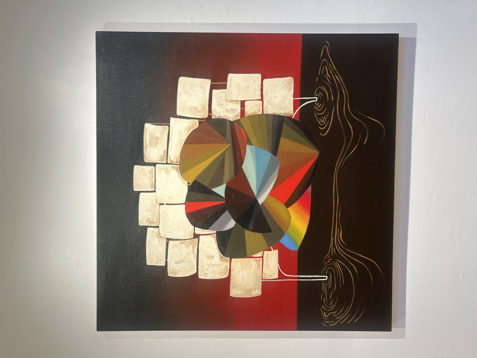 An abstract painting dominated by black, red, and brown hues. The left side features a gradient from black to red, with a grid-like arrangement of textured, beige squares. A central geometric form consists of multicolored pie slices, including red, yellow, blue, and gray. On the right, a dark brown background hosts stylized, elongated woodgrain patterns in gold. A white line connects the central form to the right side. The canvas is presented against a white wall.