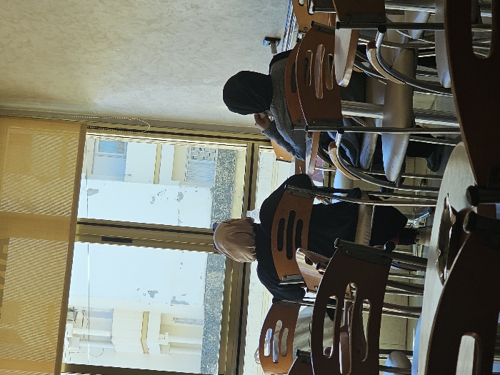 The image depicts the interior of a cafe or similar establishment in El Hajeb, Morocco, looking outwards through a large window. Two individuals, appearing to be female, are seated at tables with their backs to the viewer, facing the window. The individual on the left wears a light beige headscarf and a dark long-sleeved top, seated on a wooden chair with a light cushion and a slatted back. The individual on the right wears a dark headscarf and a grey long-sleeved top, seated on a metal-framed chair with a light upholstered seat and back; her right hand is raised towards her face. In the foreground, a blurred round wooden table features an ashtray. Numerous other round wooden tables and a mix of wooden and metal-framed chairs are visible throughout the interior. The window, framed in a dark material, is partially covered at the top by a light-colored roller blind. A thin chain for the blind hangs vertically on the right. The interior wall on the right is textured and light beige. Through the window, multiple light-colored, multi-story urban buildings are visible under a clear blue sky. These buildings feature balconies and windows, and their facades show signs of wear or peeling paint. A flat, dark grey surface is discernible between the foreground and the distant buildings. Both individuals are passively oriented towards the exterior view; no direct interaction or specific activity between them is observed.