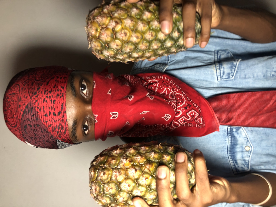 The image depicts a dark-skinned individual positioned centrally against a plain light grey background, in Ngleshi Amanfro, Ghana. The person is wearing a red durag or head wrap with a darker pattern and a red bandana covering their nose and mouth, revealing only their dark, wide-set eyes which gaze directly forward. They are dressed in a light blue denim shirt with a visible front pocket and a red tie. The individual holds a whole pineapple in each hand, extended forward towards the viewer. Both pineapples appear ripe, with yellowish-green, segmented skin, and lack their leafy crowns. A plain white bracelet is visible on the individual's left wrist.