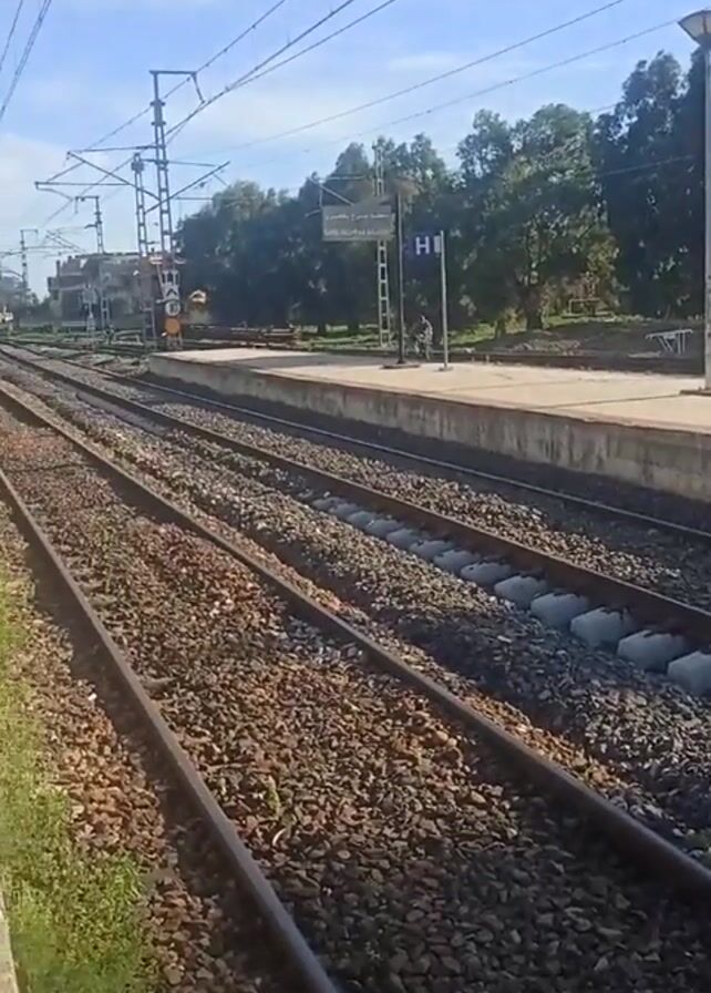 The camera pans along a railway platform, showing a sign reading "GARE MECHRAA BELKSIRI" in both Arabic and French