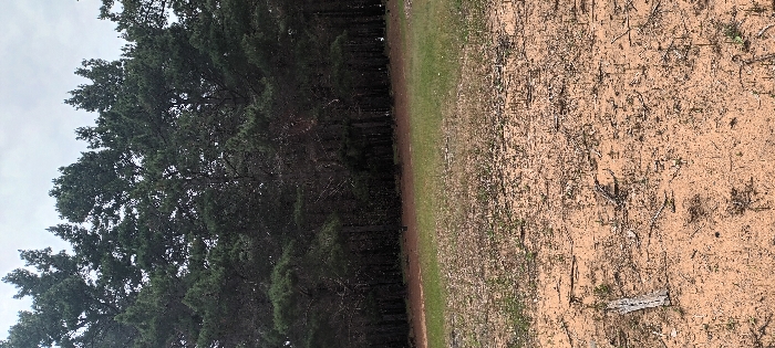 This image depicts an outdoor natural environment, reportedly located in Casablanca, Chile. The foreground features disturbed light reddish-brown soil with sparse, short green herbaceous growth and scattered organic debris, including a prominent piece of pale, weathered wood oriented diagonally in the lower-left quadrant. Immediately behind this, a strip of vibrant green grass is visible, transitioning into a narrow band of darker reddish-brown earth. The upper two-thirds of the image are dominated by a dense stand of tall, dark green coniferous trees, consistent with a pine forest, with individual tree trunks partially discernible through the dense foliage. An overcast, light grey sky occupies the top portion of the frame above the tree line. The scene is devoid of any discernible individuals, animals, or man-made objects or structures. No actions or interactions are depicted.