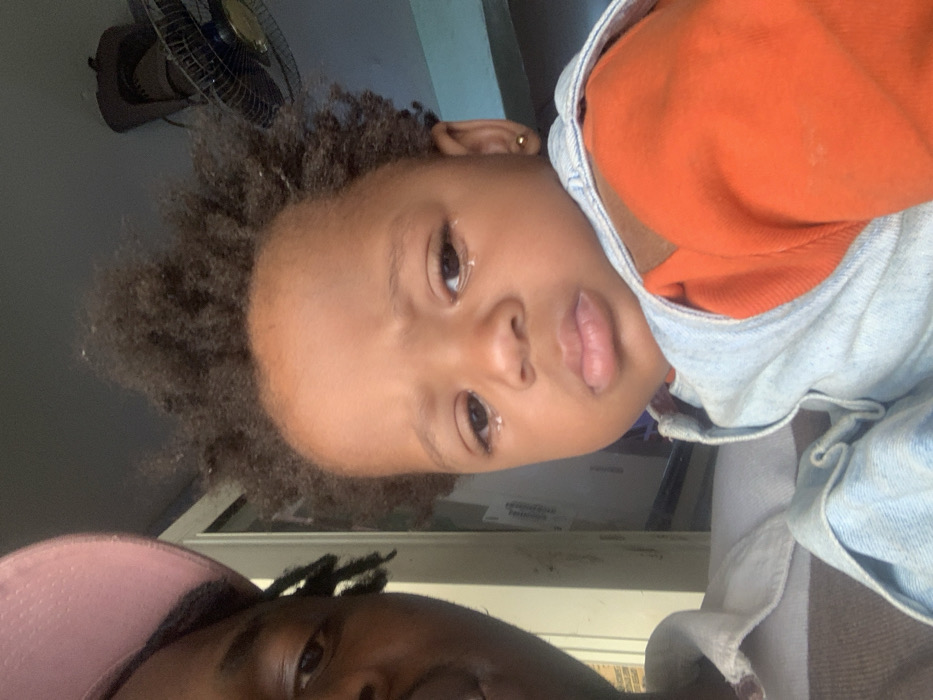 The image presents an indoor scene featuring two individuals: an adult and an infant. On the left, a portion of an adult's face is visible, characterized by dark skin, a pink baseball cap, and visible dreadlocks. The adult wears a horizontal striped shirt, white and brown in color, and appears to be holding the infant. The central and dominant subject is an infant with dark skin and dark, curly hair. The infant's facial expression indicates distress, with visible tears streaming from both eyes and a pouting mouth. A small gold-colored stud earring is present in the infant's right ear. The infant is dressed in an orange long-sleeved shirt beneath light blue denim overalls. In the upper right background, a dark-colored ceiling fan is mounted on a light-colored ceiling. A light-colored wall or doorframe is discernible in the background, positioned between the two subjects. The setting for this image is a residential or similar indoor environment in Jos, Nigeria.