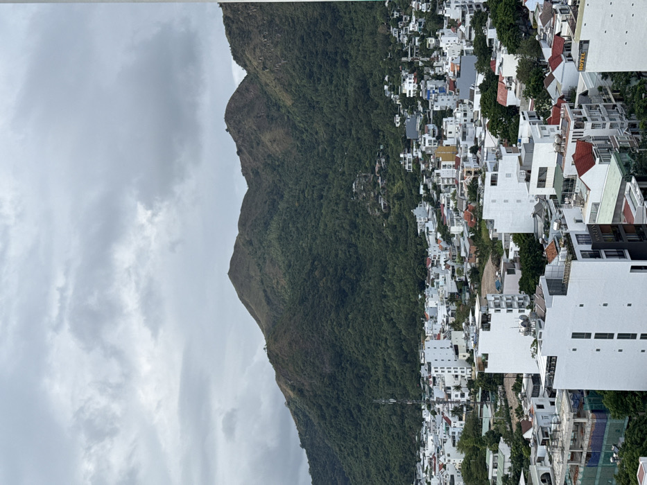 An elevated view captures a segment of Nha Trang, Vietnam, under an overcast sky. The background is dominated by a substantial, tree-covered mountain range exhibiting several peaks with varying vegetation density, primarily dark green and brown. Numerous small structures are sparsely visible on the lower mountain slopes, indicating habitation extending into the foothills. Below the mountains, a dense urban landscape unfolds, characterized by a mix of low-to-mid-rise buildings. The structures are predominantly white or light-colored, featuring various roof types, including flat concrete and sloped red-tiled roofs. Many rooftops are equipped with solar water heaters. Notable features in the cityscape include a tall communications tower positioned mid-left against the mountain, a multi-story building under construction with green netting visible in the lower-left, and a building displaying "HOTEL" signage in yellow lettering on its upper facade in the lower-right. Another building in the lower-middle has "MAZUIYN" written vertically on a dark grey section of its exterior. No individuals, overt actions, or interactions are discernible. The environment is urban-mountainous under a grey, cloudy sky.