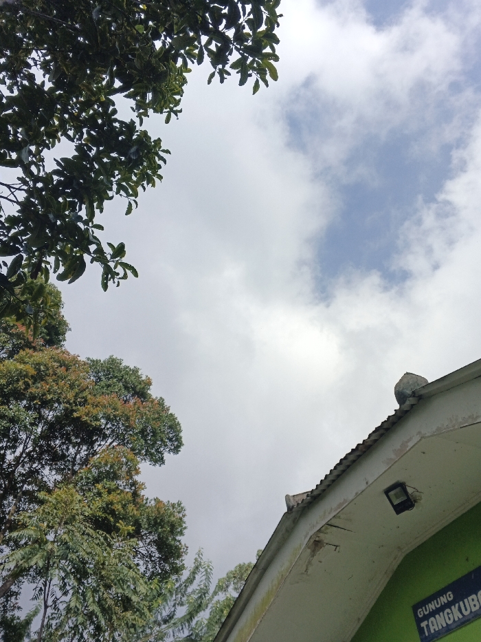 The image presents an upward-looking view encompassing a sky, various trees, and a building structure. The sky occupies the majority of the frame, displaying scattered white and grey clouds with visible patches of clear blue sky. In the upper left quadrant, dense dark green foliage from a large tree extends into the frame. Towards the mid-left and lower-left, additional trees are visible with a mix of green and reddish-brown leaves. In the lower right, the edge of a building is seen, featuring a corrugated metal roof. The underside of the eaves is painted a light color, exhibiting noticeable peeling paint and discoloration. A dark, rectangular outdoor light fixture is mounted on the underside of these eaves. Below the eaves, a section of a bright green wall is visible, on which white text partially reads "GUNUNG TANGKUBO". No people or explicit actions are visible. The depicted scene is located in Nanlao, China.