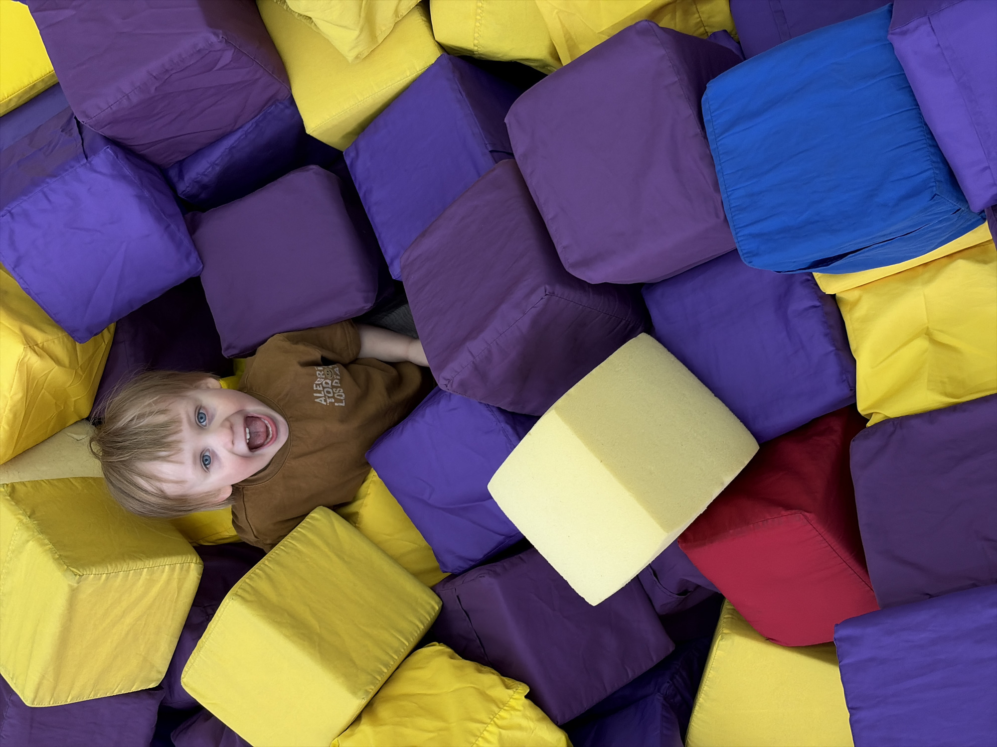 A child with blonde hair and blue eyes lies in a pit of purple, yellow, blue, and red foam blocks