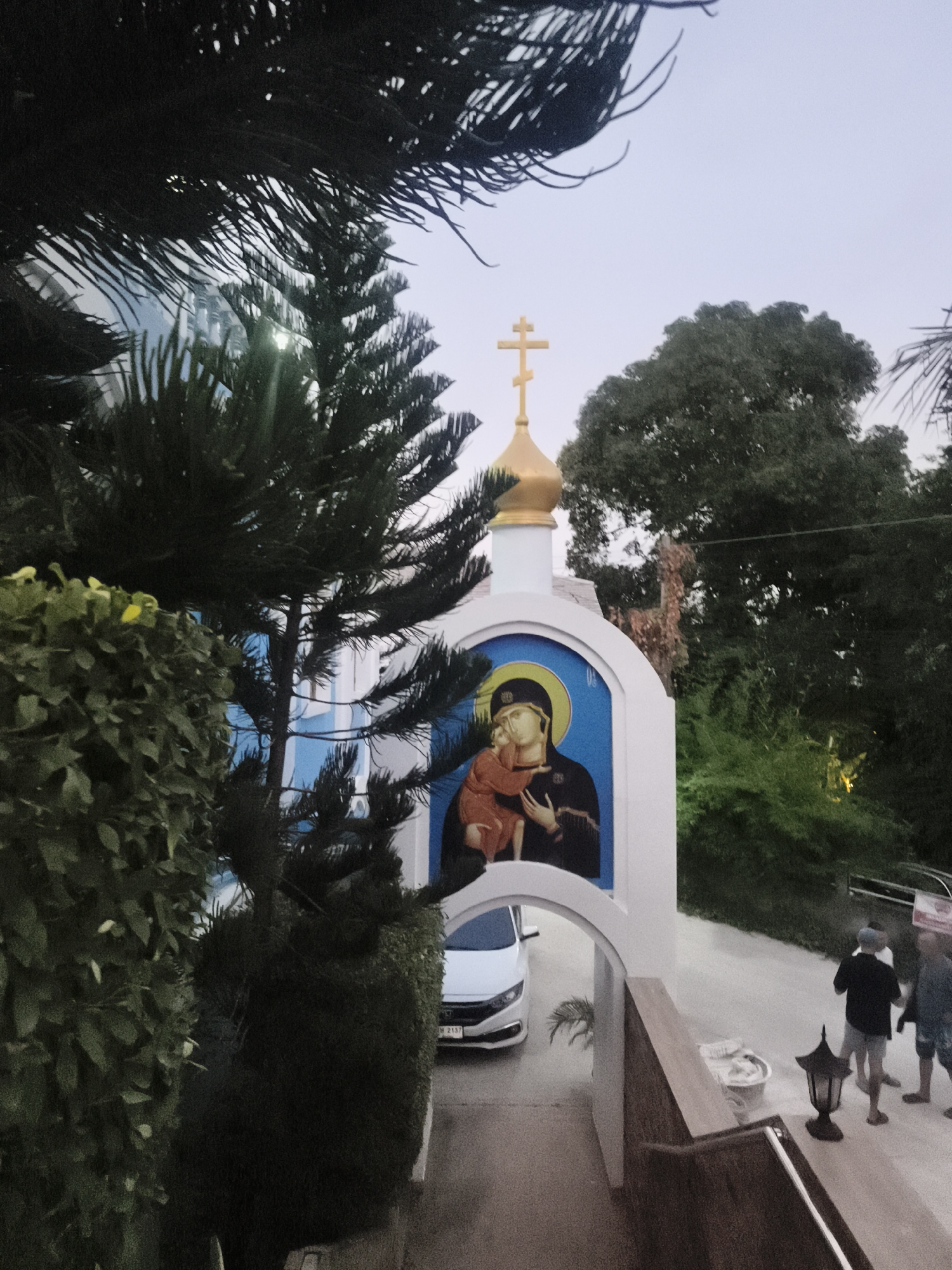 The image depicts an exterior view of an Orthodox church structure, identified as the Church of All Saints in Ko Samui, Thailand. The central subject is a white, arch-shaped entrance or chapel, topped with a golden onion dome and a prominent golden Orthodox cross. Within the arch, a large icon of the Theotokos (Virgin Mary) holding the Christ Child is displayed against a blue background with golden halos. Dense green foliage, including tall conifer-like trees, partially frames the scene from the left and top. To the right of the church structure, a paved pathway or road is visible. Three adult males are walking along this path, moving away from the viewer; all are dressed in casual attire, primarily dark shirts and shorts. One individual wears a white cap. Through the archway on the left, a white modern sedan, consistent with a Honda Civic model, is visible on a driveway, with a partially obscured Thai license plate (M 2137). In the lower right foreground, a dark, ornate outdoor lantern rests on a brown-colored wall or railing. Adjacent to the lantern, a white plastic basket is positioned on a nearby ledge. The sky is a uniform light gray, indicating a twilight or overcast daytime condition. Large green trees form the background beyond the immediate vicinity of the church.
