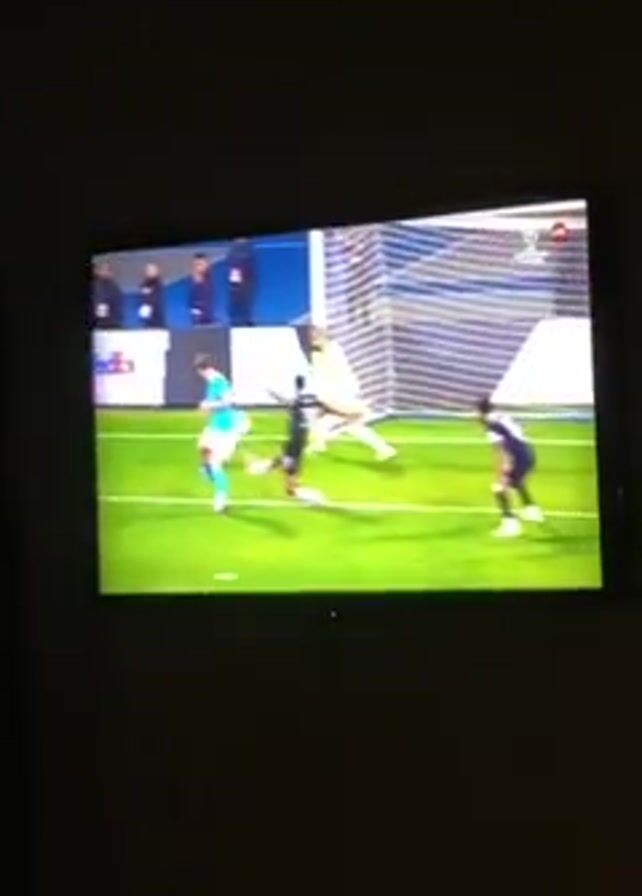 soccer match being played on a television screen, filmed in a dimly lit room. The players, wearing light blue and dark jerseys, are positioned around the penalty box. A player in a light blue jersey kicks the ball towards the goal. The goalkeeper, wearing a yellow jersey, is in the net, attempting to block the shot. Another player in a dark jersey falls to the ground nearby. A logo indicates the game is part of the Champions League. A FedEx advertising board is visible behind the goal. The artificial grass is green with white lines. Additional team members and coaches stand along the sidelines.