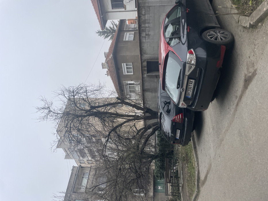 The image presents an urban street scene in Vidin, Bulgaria, under an overcast gray sky. The ground surface is composed of asphalt or concrete, exhibiting visible stains and tire marks. Two vehicles are centrally positioned: In the foreground to the right, a dark-colored Subaru Impreza hatchback is parked, distinctive with its red-painted roof and red lower rear bodywork accents. Its Bulgarian license plate reads BH 3361 AK. Directly behind it, a black Mercedes-Benz C200 CDI station wagon (W203 model) is partially visible, bearing the Bulgarian license plate CB 5116 HA. To the left of the vehicles, a small ground area with sparse grass and bare patches contains a dark-colored park bench with a metal frame and wooden slats. The background is dominated by various structures and vegetation. A large, bare deciduous tree with extensive branches stands prominently in the midground. Behind it and to the left, a tall, multi-story apartment building with a light-colored facade is visible. To the right of the large tree, a two-story residential building with a reddish-brown tiled roof, light-colored walls, and multiple white-framed windows (some with exterior roller blinds) is situated behind a low, unpainted concrete wall. This wall features a small, dark rectangular opening at its base. Further to the far right, a section of another building with a tiled roof and a conifer tree are visible. No individuals are present in the scene.