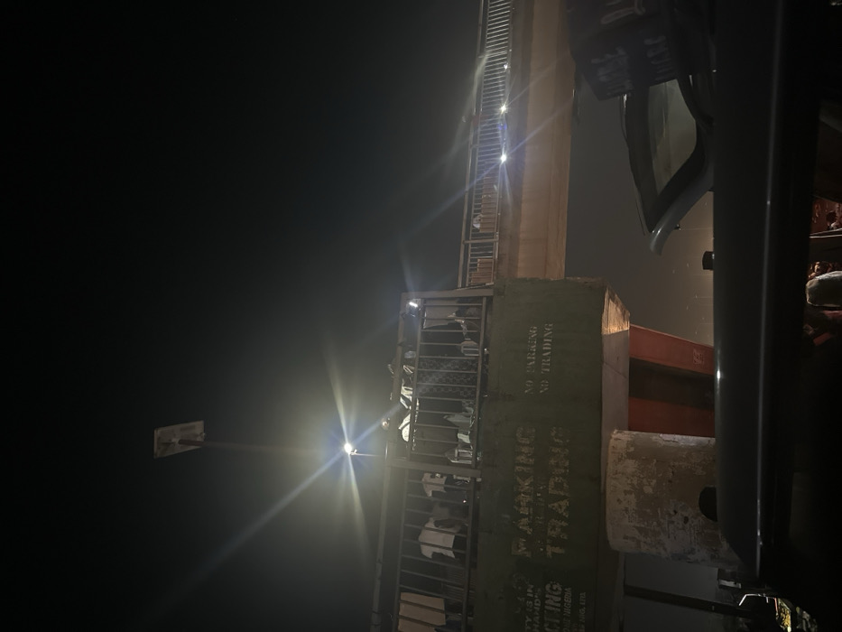 A tall, vertical structure is illuminated at night. The structure appears to be a multi-level platform with metal railings. "NO PARKING, NO TRADING" is painted on the side of a lower section. People are present on the platform. A ladder ascends the structure. A street light casts a bright glow. A vehicle frame is visible on the right, suggesting the photo was taken from inside a car.