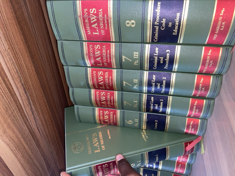 In Kabala, Nigeria, a close-up view depicts a dark-skinned human hand grasping and extracting a volume from a series of legal reference books on a wooden shelf