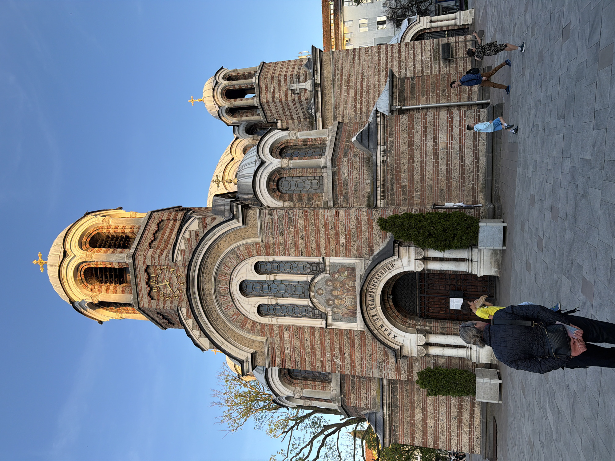 The image depicts the Church of St. George Rotunda in Sofia, Bulgaria. The building is constructed of brick and stone with rounded windows and arched doorways. Two rounded towers are visible. People are walking on the paving stone surface to the right of the church. Three people are walking past the building's edge. Two people are standing near the entrance. A clear blue sky is visible above. A portion of a tree is visible in the lower left. A building can be seen in the background.