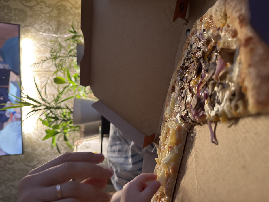 The scene is indoors, located in Chaikovsky, Russia. A partially consumed pizza rests in an open cardboard delivery box, angled towards the viewer. The pizza is a split-topping variety; the visible left half features pineapple chunks, while the visible right half contains toppings including mushrooms and red onions. An adult's left hand, adorned with a plain metallic wedding band on the ring finger, is positioned above a smaller child's hand. The child's hand is reaching towards the pineapple-topped section of the pizza. In the blurred midground, a seated person wearing a light-colored striped shirt is discernible. The background features patterned wallpaper, several potted green plants arranged on a surface, and a wall-mounted flat-screen television displaying content with human figures. A warm, diffused light source illuminates the background from behind the plants.