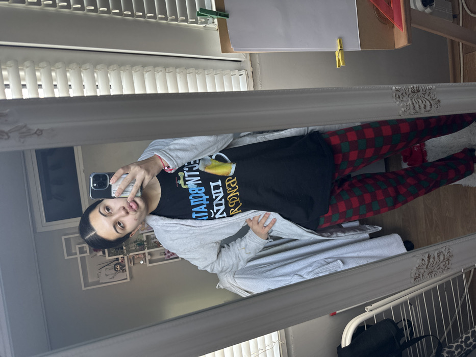 The scene depicts a young female in a residential interior in Vidin, Bulgaria, captured via a mirror selfie. The female, positioned centrally, is observed from mid-thigh up, facing the mirror. Her dark hair is pulled back, and she exhibits a pursed-lip expression. She wears a black t-shirt featuring a graphic design with a beer tap and mug (text appears reversed), a light grey quilted robe or cardigan, and red and green plaid pajama bottoms. Her right hand holds a dark-colored smartphone towards the mirror to capture the image, while her left hand is placed on her hip. A red beaded bracelet is present on her right wrist. The immediate background, reflected in the ornate white-framed mirror, reveals a room with light-colored walls. To the left, a series of white geometric wall shelves display various small decorative items. To the right, a white-framed window with horizontal blinds is partially visible, admitting natural light. An easel with a white board, affixed with green and yellow clothespins, stands to the right. A red triangular ruler is present on the easel's lower shelf. A white clothing rack with a black bag and a white garment is partially visible on the lower left. A light-colored rug is visible on the floor.
