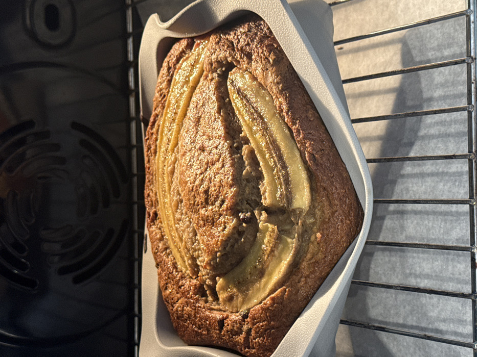 - "The image displays a freshly baked, golden-brown banana bread loaf situated within a light gray, rectangular baking pan" by FM-OZmdD3, licensed under CC BY 4.0