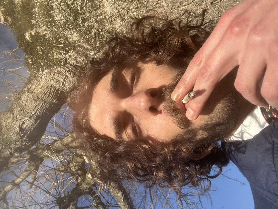 A person with curly brown hair lies on their back outside. Their eyes are closed, and they are holding a cigarette between their fingers near their mouth. The background is a blue sky with a tree branch. The person is wearing a blue shirt and a patterned tie.