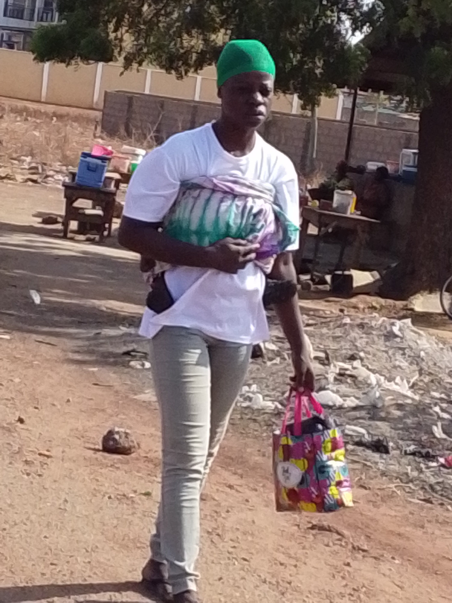 The image depicts an outdoor street scene in Dungu, Ghana. A dark-skinned adult female walks from right to left across an unpaved, reddish-brown dirt ground. She wears a green head covering, a white short-sleeved t-shirt, and light-colored trousers. An infant is secured to her back with a multi-colored fabric wrap (green, purple, white patterns), with the infant's head visible above her left shoulder. In her right hand, she carries a small, multi-colored patterned shopping bag with pink handles. The ground contains scattered debris, including a rock near her left foot and a pile of white plastic refuse to her right. In the left background, a dark wooden table supports a blue cooler with a pink lid. Behind this, a light-colored building with windows is partially visible beneath green tree foliage. In the right background, a large tree trunk is present, and behind the main subject, another wooden table, possibly a vendor's stall, is laden with indistinct objects. A low wall extends horizontally across the mid-ground. Natural sunlight illuminates the scene, casting shadows.