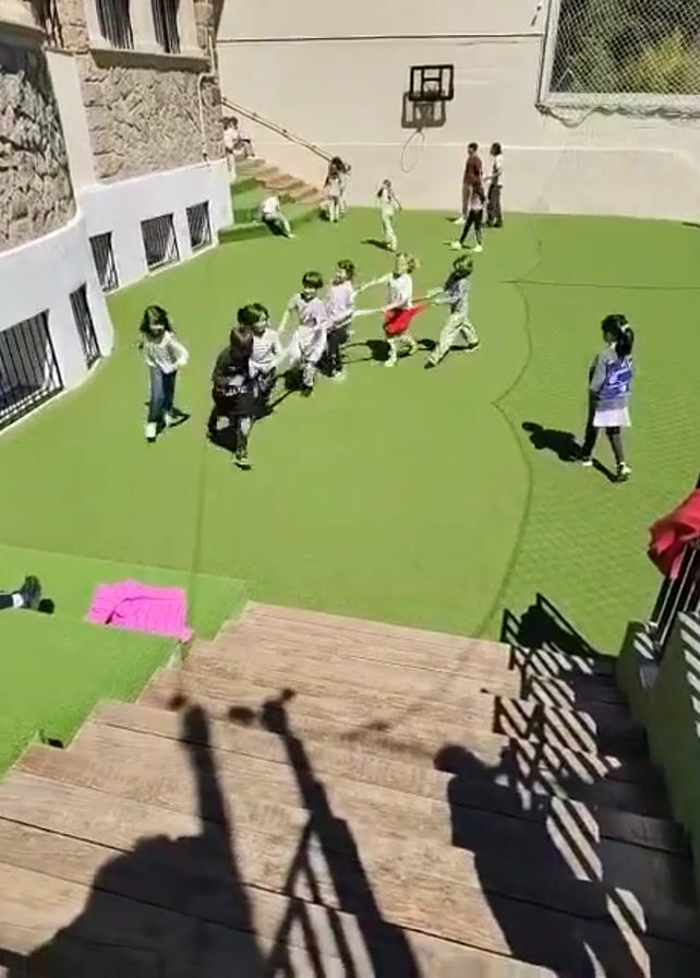 children playing a game on an outdoor, artificial-turf play area, viewed from an elevated wooden staircase. Approximately ten children are connected by a long piece of white fabric, pulling and running to either side, seemingly trying to separate each other. Other individuals, appearing to be adults, are standing and walking in the background. A pink cloth lies on the grass near the bottom of the stairs, and a red jacket is draped over the staircase railing. The area is enclosed by buildings, with a basketball hoop visible on one wall and a netted fence along another side. The light suggests a sunny day, with long shadows cast across the stairs.