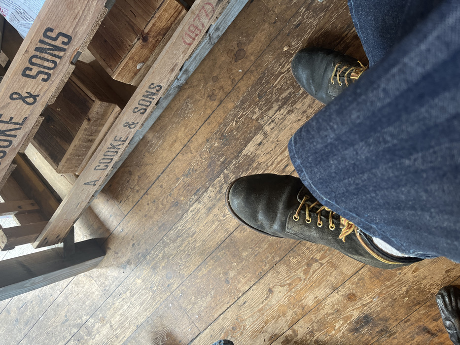 The image displays a first-person, downward-angled view of the observer's lower legs and feet, situated within a retail or market environment. The observer wears dark blue denim jeans and dark, possibly suede, lace-up boots with yellow laces; light-colored socks are visible above the left boot. The floor consists of worn, light-to-medium brown wooden planks exhibiting visible grain, scuff marks, and scattered dark stains. In the background, a rustic wooden display unit is visible, constructed from rough-hewn planks and posts. Several planks bear black stenciled text, reading "COOKE & SONS" and "A. COOKE & SONS." A faded red stenciled number, "(037)," is present on a lower plank to the right. Small, empty wooden crates are nestled within the display structure. This scene is identified as occurring at A. Cooke & Sons, a greengrocer and wholesaler located in Brighton, United Kingdom.