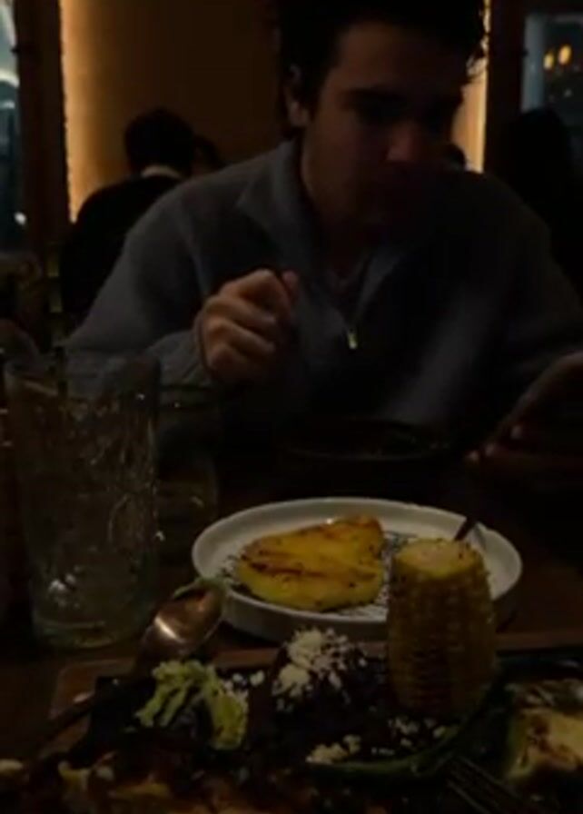 A young man sits at a restaurant table, facing the camera. He is wearing a light blue quarter-zip sweater and has dark hair. He uses a spoon in one hand and a phone in the other. On the table in front of him are the remnants of a meal: a half-eaten plate containing grilled pineapple and corn on the cob, a wooden board with what appears to be the remains of a main dish, and a tall glass with a straw. The restaurant lighting is dim. Another person walks behind him out of focus.