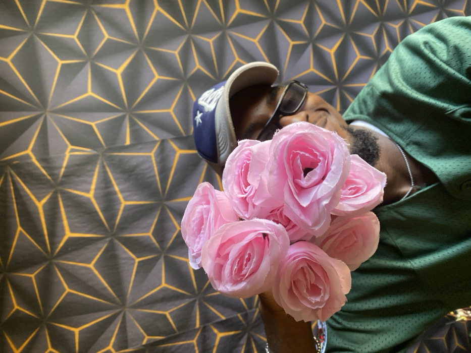 - "A person wearing a blue and white baseball cap, sunglasses, and a green shirt is holding a bouquet of light pink roses" by FM-lXISs1, licensed under CC BY 4.0