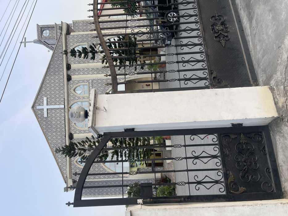 A tilted outdoor shot reveals a church behind a black metal gate and a white concrete pillar. The church has a patterned facade, arched windows, and a large white cross. A smaller tower with a cross sits to the left. Wires stretch across the upper left sky. A car is partially visible through the gate. A small Christmas tree sits next to the pillar.