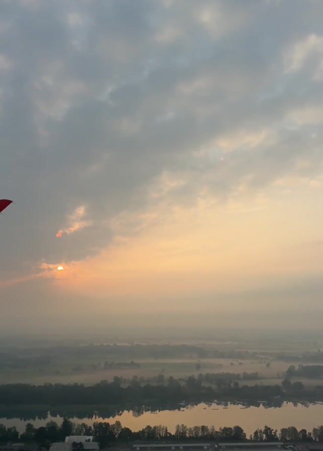 The video presents a scenic, elevated view of a landscape at sunrise or sunset. The sun is visible through a light cloud cover, creating a soft, diffused light. Mist hangs over the fields and water bodies, partially obscuring the view. A large industrial or commercial complex is visible in the foreground, complete with parking lots, buildings, and vehicles. A small red object is visible in the top left corner of the frame. The sky is filled with varied cloud formations, with a range of grey and pastel colors from the setting sun.
