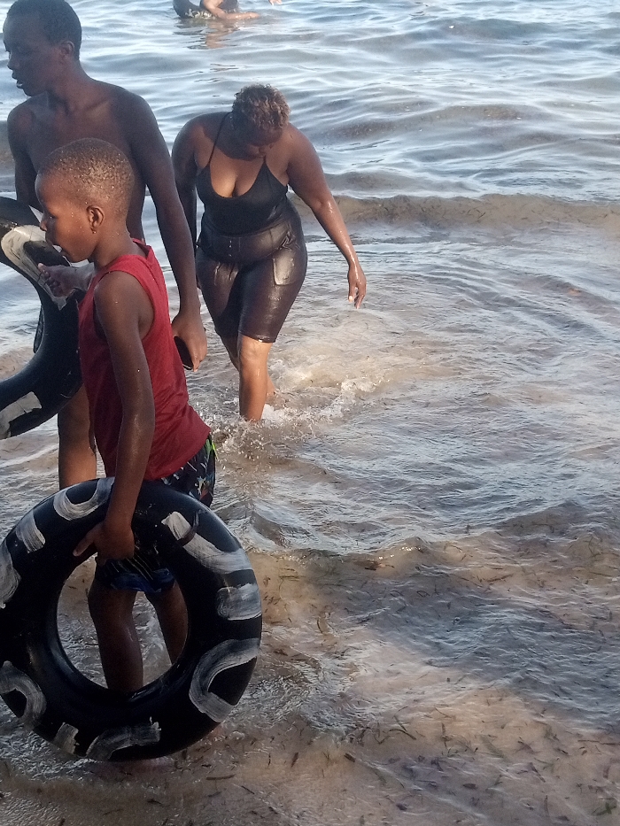 The scene depicts a group of four individuals in a body of water within Shanzu ward, Kenya, during daytime. In the foreground, an adult male with dark skin stands shirtless, facing right, partially submerged to his waist, holding a black inner tube. To his right and slightly forward, a young boy with dark skin wears a red tank top and patterned swim shorts; he is submerged to his knees and holds a black inner tube with white painted markings. To the right, an adult female with dark skin, wearing a black swimsuit, walks into the water, submerged to her knees, with her gaze directed downwards; she holds a dark-colored smartphone in her right hand. Further in the background, another individual is partially visible in deeper water. The water exhibits small ripples and contains visible submerged organic matter, consistent with a coastal or lake environment.