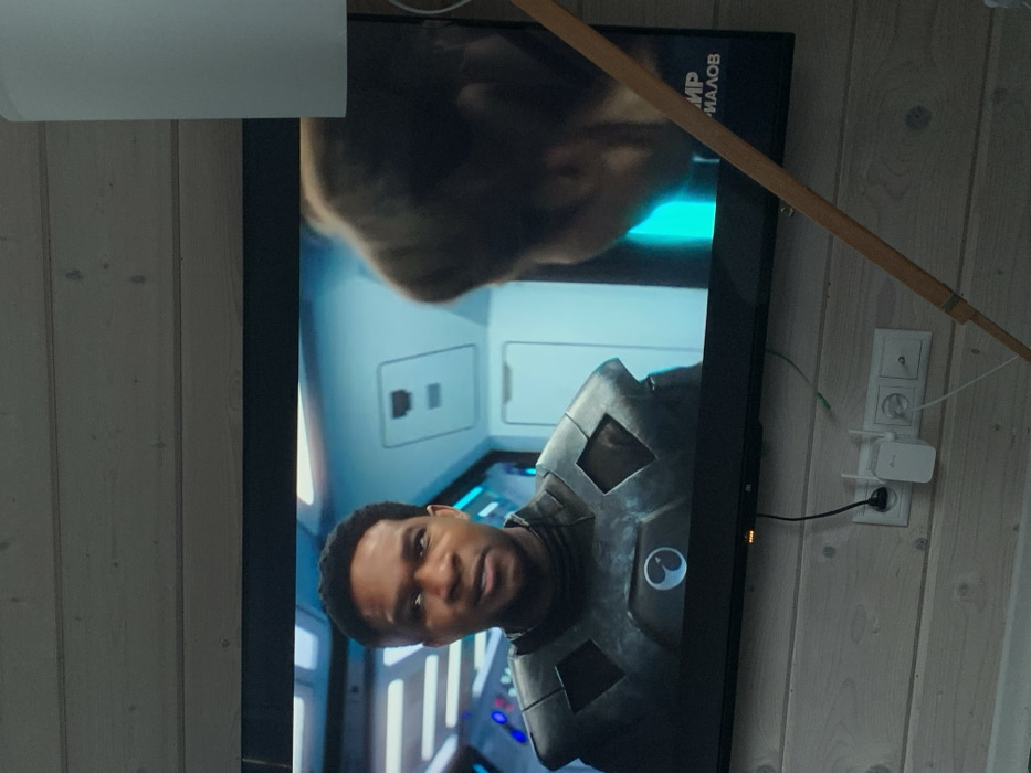 flat screen television mounted on a wall, with a scene from a science fiction movie playing on the screen. The scene takes place on a spaceship or space station. A Black man in a dark, futuristic suit is speaking to another person, who is only partially visible. The person's back is turned toward the viewer, but they are looking off to the side. The room is lit by a large, white floor lamp in the foreground, which is situated on the right side of the screen. There is a wall outlet and a wireless router beneath the television. The wall appears to be made of painted wood paneling. The scene is set in an interior location, likely a home or a hotel room, in the city of Svetloe, Russia, based on the coordinates provided. The location is identified through the latitude and longitude coordinates, which are 60.548 and 29.796, respectively.