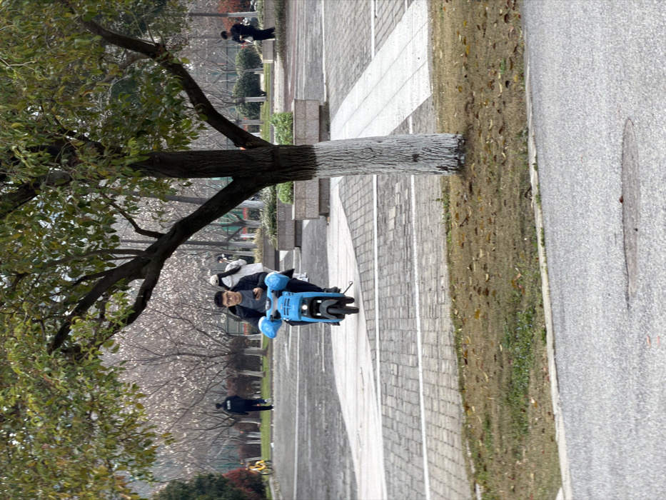 An outdoor scene in a public space within Jiangning District, China, under an overcast sky. A male individual, wearing glasses, a dark jacket, and dark pants, rides a blue electric scooter from left to right across a paved walkway constructed of interlocking grey and light-colored bricks. His hands, encased in light blue handlebar muffs, hold a smartphone, at which he is looking down. The scooter has a kickstand deployed on its left side. To the right of the scooter rider, a tree with green foliage, its lower trunk painted white, stands on a patch of dry grass with scattered brown leaves. In the mid-ground, a second individual in a white jacket and a light-colored cap walks away from the camera, partially obscured by the scooter rider. To the far right, a third individual in dark clothing stands, looking down at a smartphone. On the far left, a fourth individual in dark clothing walks away from the camera, near a parked yellow shared bicycle. The background features multiple deciduous trees, many with bare branches, alongside shrubs and concrete planters containing greenery. The foreground consists of an asphalt road with a visible manhole cover.