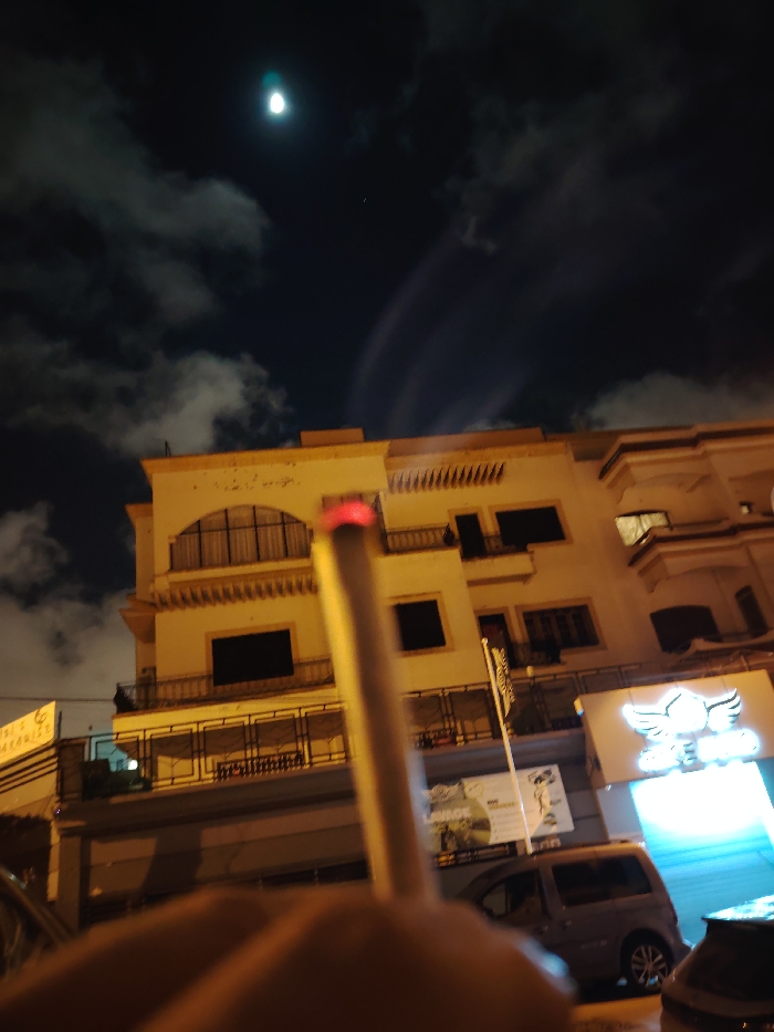 The image depicts a nighttime urban environment in Tangier, Morocco. In the lower foreground, a blurred hand holds a lit cigarette vertically, its ember glowing red and sharply in focus. Behind this, a multi-story building with a light-colored facade is illuminated by artificial light. The building features multiple windows, including a large arched window on an upper floor, and balconies with dark railings. At street level, a light-colored minivan is partially visible, and a neon sign with a winged logo and partial text "Ego" is brightly lit on the building's lower section. Other commercial signs and a flagpole are also present. The dark sky above contains scattered clouds, a bright crescent moon in the upper left, and faint, curved light streaks.