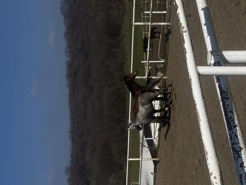 The image captures an outdoor equestrian facility located in Arbanassi, Bulgaria. The scene is presented under a clear blue sky with minimal cloud cover. In the foreground, a weathered white two-bar fence traverses horizontally across the lower portion of the frame. Behind this fence, a dirt paddock is enclosed by similar white fencing. Within the primary dirt paddock, a grey dapple horse is prominently positioned on the left, depicted in motion with its head turned to the right. Directly behind it stands a chestnut-colored horse, facing right. To the right, within the same enclosure, a lighter grey horse is resting on the ground. Beyond this main paddock, a section of green grass is visible, containing two additional horses: a dark brown horse standing towards the left, and a smaller, dark brown horse positioned further right. The distant background features a dense, deciduous forest with bare trees, indicative of a late winter or early spring season. The overall environment is illuminated by bright sunlight, casting distinct shadows. No human figures are present.