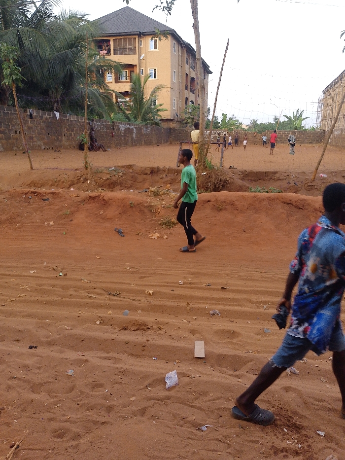 A dusty outdoor scene shows boys playing soccer. A net spans between two makeshift poles in a dirt field surrounded by low brick walls. A yellow apartment building with a dark roof sits behind the wall on the left. Two boys walk in the foreground. One wears a green shirt and dark pants, and the other wears a patterned blue shirt and jean shorts. Litter dots the reddish-brown, sandy ground.
