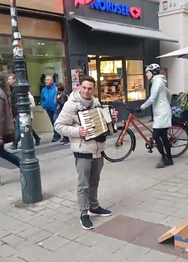 - "A man is playing an accordion on a city sidewalk in front of a Nordsee restaurant" by FM-KlF1C3, licensed under CC BY 4.0