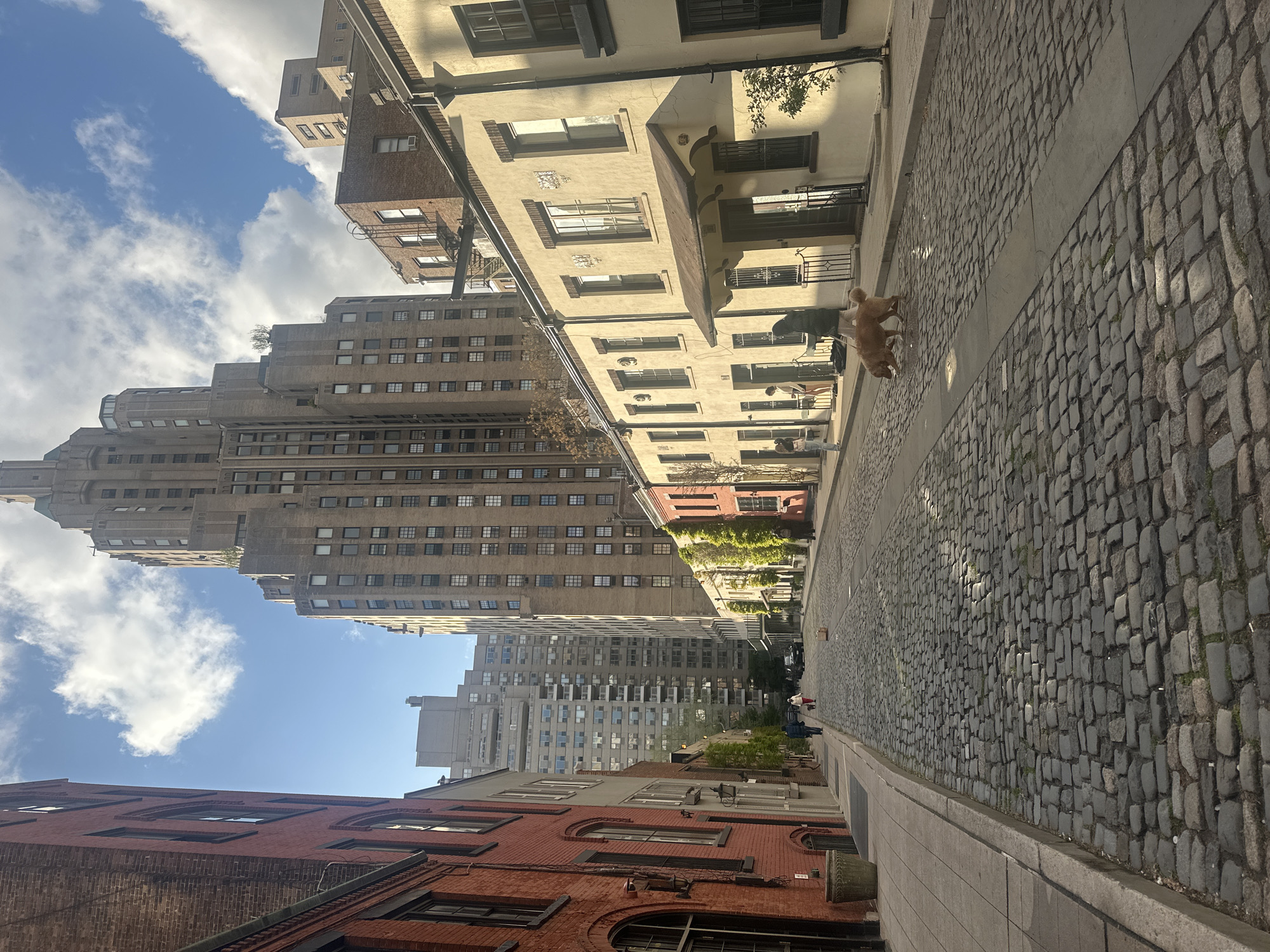The image presents a street scene in New York City, United States. The street is paved with cobblestones and lined with buildings of varying heights and architectural styles. There is a tan-colored dog walking on the right side of the street. The buildings are constructed from brick and stone, with a mix of red, brown, and tan colors. The taller buildings rise significantly, partially obscuring the sky, which shows patches of blue and scattered clouds. Several people are walking further down the street.