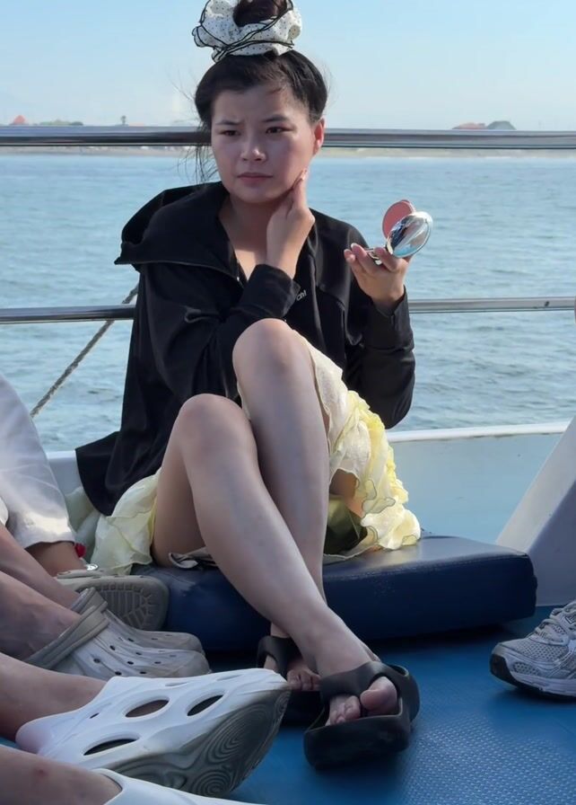 A young Asian woman is sitting on a blue bench on a boat, applying makeup with a small, round mirror. She is wearing a black hoodie, a yellow dress, and black sandals. Her hair is tied up in a bun with a patterned ribbon. The boat is on the water, with a railing visible behind her and other passengers around her. Various shoes are scattered on the deck. The weather appears to be sunny.