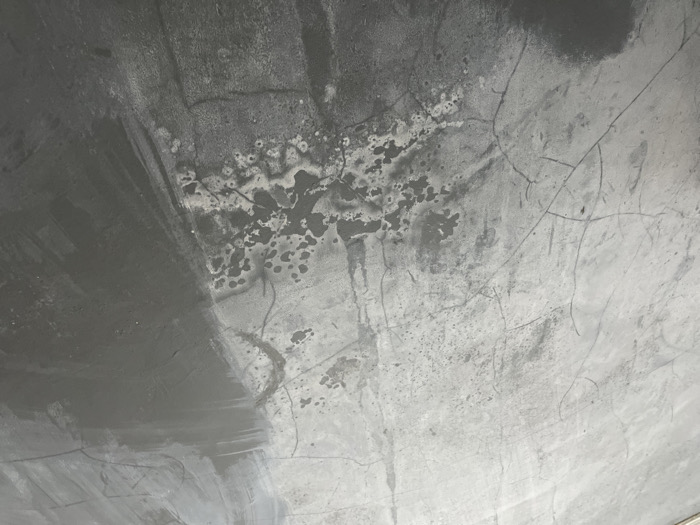 close-up of a gray, cracked surface. There are distinct patterns of moisture or damage, appearing as darker blotches with ring-like formations. Fine cracks extend across the surface, suggesting age or wear. Areas of smoother, darker gray possibly indicate recent patching or repair. The surface texture is rough and uneven.