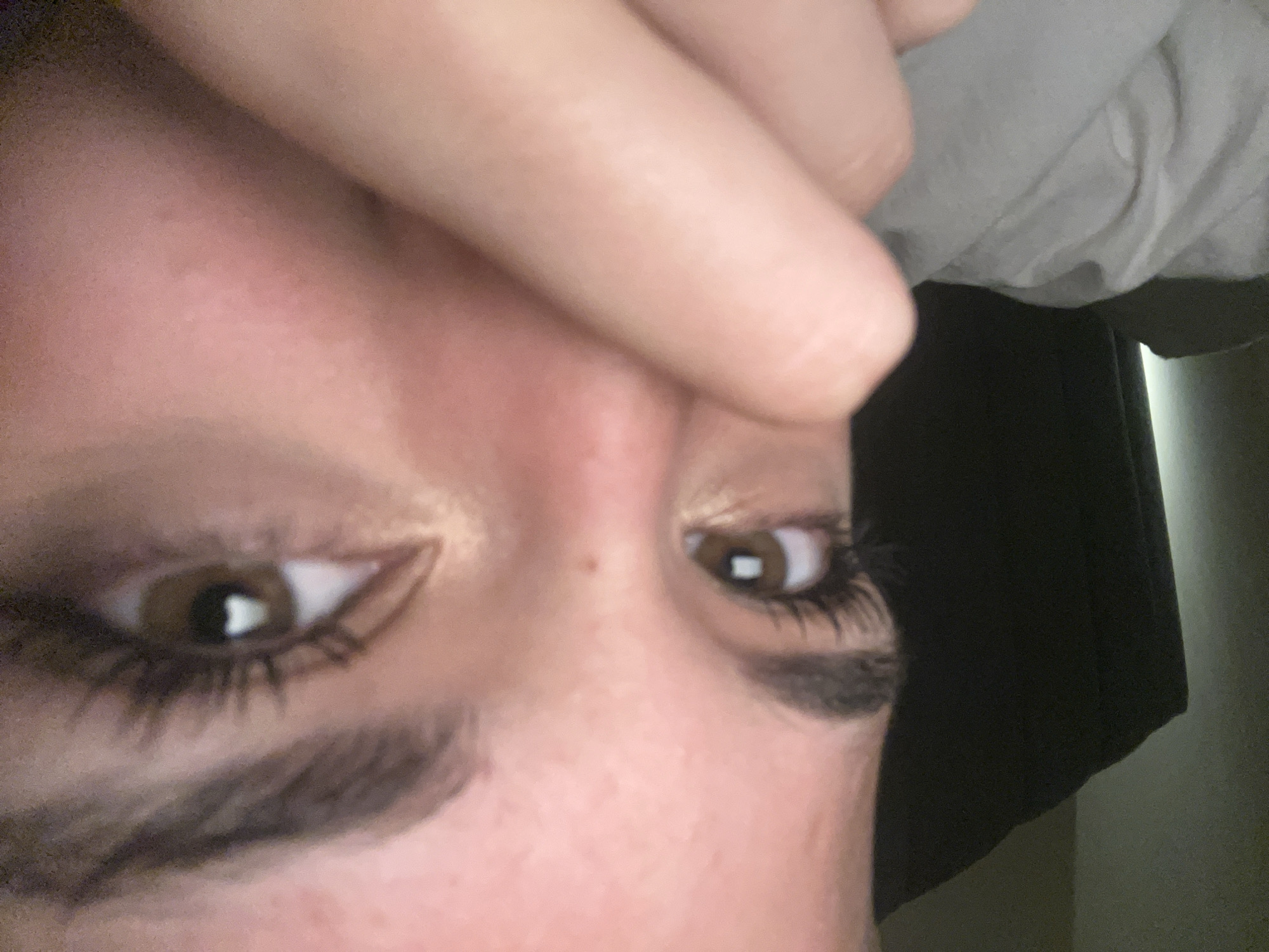 close-up of a person's face, focusing on the eyes and eyebrows. The person has brown eyes and well-defined eyebrows. Eyeliner and mascara are visible. A finger is near the person's forehead. A piece of clothing (grey) is in the background near the right side of the photo above the finger, along with what appears to be a hanging garment (black). The location in the city of Ivanyane, Bulgaria cannot be determined from the information available in the image.