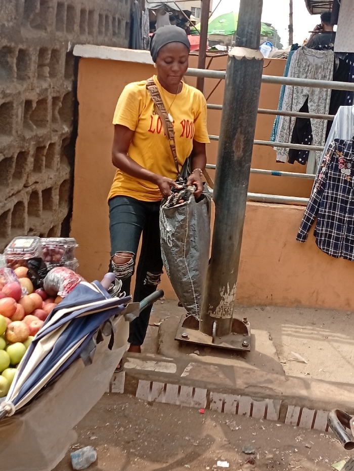 A woman in a yellow t-shirt, dark jeans with knee rips, and a black headscarf stands on a street. She holds a dark, possibly plastic bag. A cart filled with apples sits to her left, along with a closed umbrella. Clothing hangs on a rack behind her. A large pole is located next to her. The ground is rough with dirt and debris. Buildings flank the scene.
