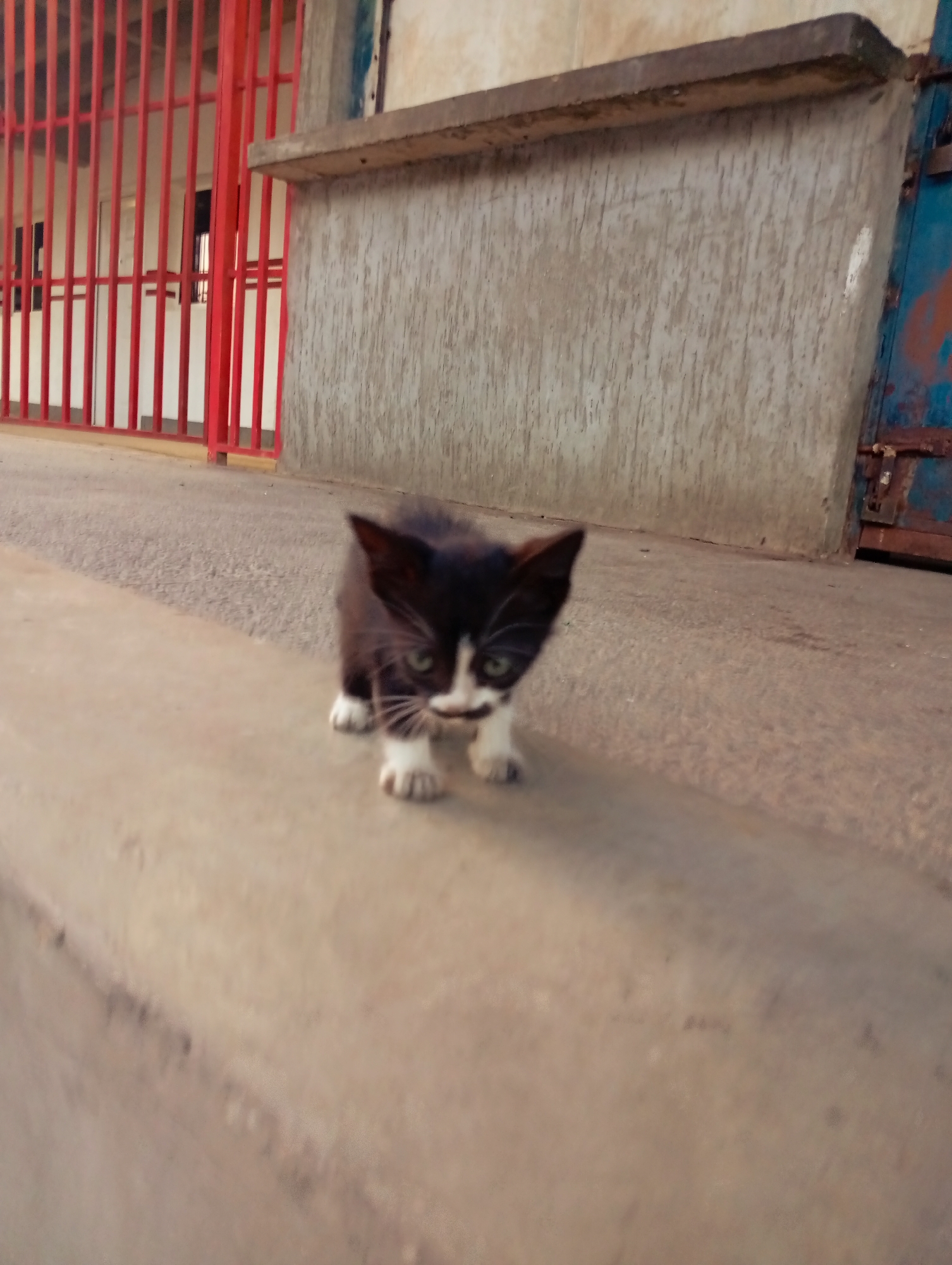 A small black and white kitten stands on a concrete ledge. The kitten is facing forward with its paws visible. Behind the kitten is a building with a textured concrete wall. A red metal gate is to the left. The location is Juan Griego, Venezuela.