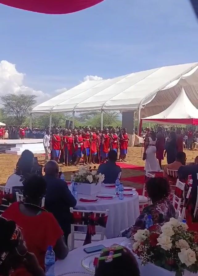 The video depicts an outdoor wedding celebration. Under a large white tent adorned with red drapery, seated guests observe a group of people in traditional red and blue clothing holding sticks, presumably performing a cultural dance. The guests sit at tables decorated with white linens, floral centerpieces, and water bottles. A red carpet leads to the performance area. Beyond the tent, a landscape of trees and a partly cloudy sky are visible.