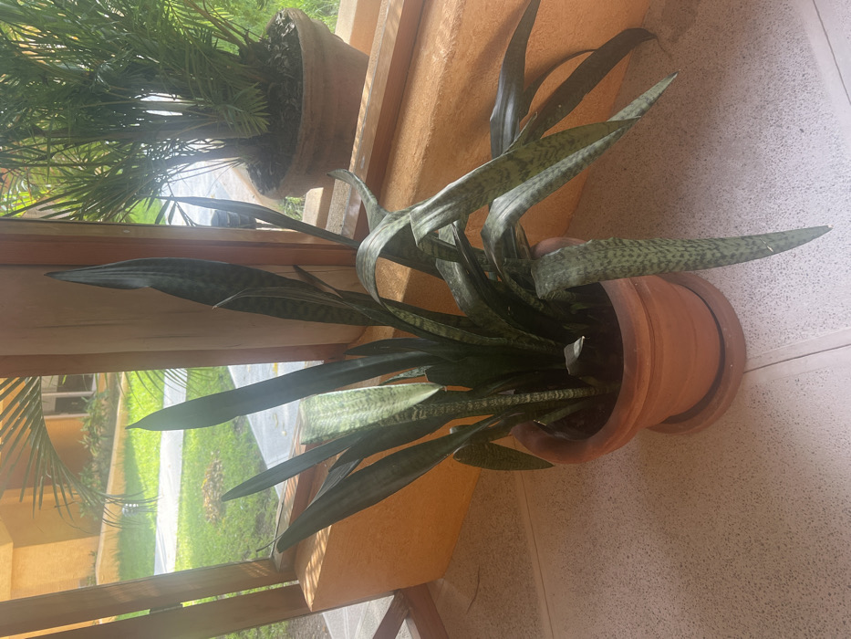 A potted snake plant with long, sword-like leaves is centered. The plant is in a terracotta pot on a tan surface. Another potted palm is visible in the background. The scene is bright, with a view to the outside. The natural light and vegetation suggest it is daytime.