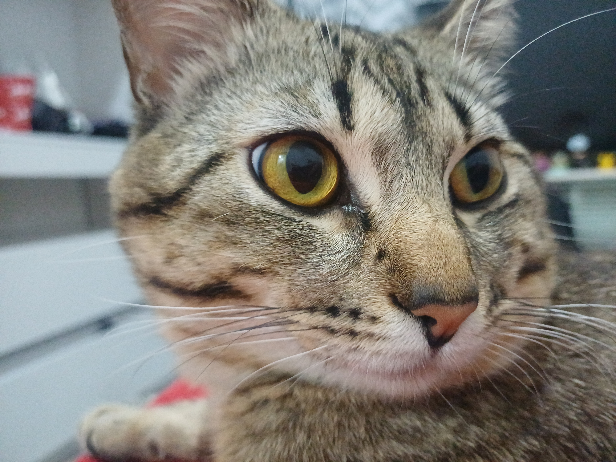The scene depicts a domestic short-haired tabby cat, likely a mackerel tabby, in a close-up portrait. The animal possesses distinct dark brown and black stripes against a lighter brown and gray fur base, particularly noticeable on its head, ears, and back. Its eyes are large, round, and an intense amber-yellow with vertically elliptical, dilated pupils that reflect a light source. The cat's nose is pinkish-brown, and numerous long white whiskers extend from its muzzle. The subject's head is slightly angled to the right, with its gaze directed forward and slightly upwards. A portion of a front paw is visible in the lower left, resting on a red textured surface, possibly a blanket or cushion. The background is significantly blurred, indicating a shallow depth of field. On the left side, indistinct shapes in red, white, and dark tones are visible against a light gray, out-of-focus background. The right side of the background is darker and less discernible. The environment appears to be an indoor setting. The scene is situated indoors within the city of Curitiba, Brazil.