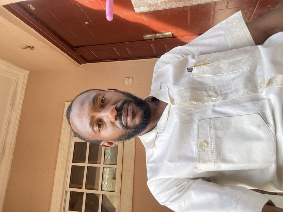 An adult male is depicted in a close-up, chest-up portrait, directly facing the camera. He possesses a medium-dark complexion, short, dark, and visibly receding hair, complemented by a full dark beard and mustache. He is attired in a light cream or off-white short-sleeved collared shirt featuring four visible light-colored buttons and two breast pockets. A golden-colored pen is clipped into the right breast pocket, which, along with the right sleeve cuff, displays a subtle geometric patterned weave. The background consists of a light brown-tan painted wall, topped with white decorative cornice molding. To the subject's left, a horizontal window with a light-colored, multi-pane frame is partially visible. To his right, a red-brown door with a silver-colored handle/lock mechanism and a peephole is present. A light-colored electrical outlet is mounted on the wall below the window. A pink, elongated object is partially visible near the top right corner of the door. The scene is illuminated by strong, directional light, consistent with daylight conditions in Sabon Tasha, Nigeria.