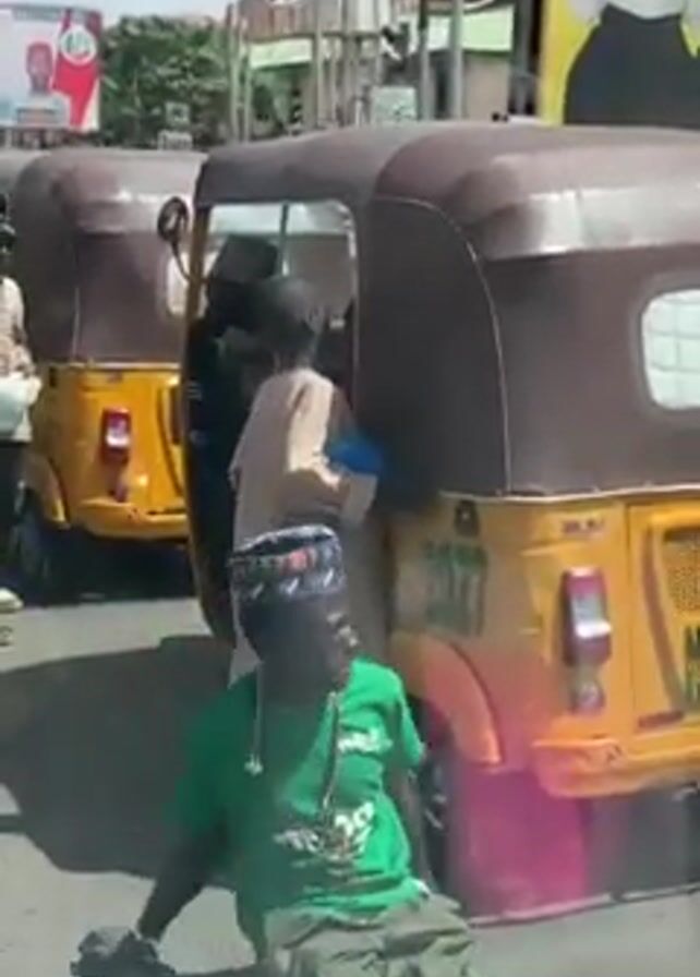 busy intersection in an urban area, likely in Africa based on the appearance of the environment and the vehicles. Several yellow auto rickshaws, also known as "tuk-tuks," are visible, stopped at a red traffic light. People are seen walking around and interacting with the vehicles. One person is kneeling on the road while others are standing near the rickshaws. A billboard is visible in the background. The video is shot from inside a vehicle, looking out through the windshield. The sky is clear and sunny.