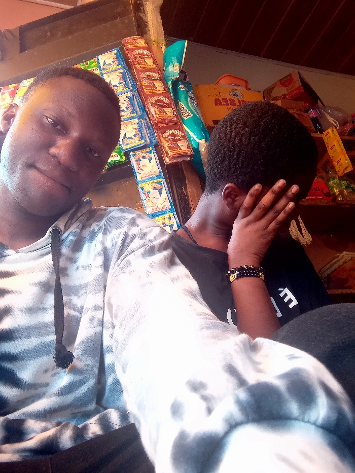 The image depicts two individuals inside what appears to be a small retail shop or kiosk, located in the city of Akpaka Forest Reser, Nigeria