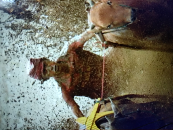 The image, rotated 90 degrees counter-clockwise, depicts one human subject and one equine animal amidst a dusty environment. Location: Unknown, Unknown. A light-skinned individual, possibly male, occupies the upper center. They wear a reddish-brown long-sleeved top and a red fabric head covering. The individual's face is visible, mouth open in an apparent shout or expression of distress. Both the individual's clothing and exposed skin are heavily coated with a light brown, granular substance, consistent with dry earth or dust. The right arm is raised, gripping a yellow strap or fabric. The left arm is bent, appearing to engage with the animal's tack. Immediately below the individual is the head and neck of a light brown equine, likely a horse or mule, oriented towards the left. The animal wears a dark bridle. Its coat is similarly covered in the light brown granular substance. The ground is composed of a textured, light brown, granular material, consistent with dry earth, sand, or finely milled organic matter, with heavier concentrations of debris on the right side of the frame. A thin red rope extends diagonally across the frame, appearing taut. The background to the left is a dark, indistinct area, while the right background is brightly lit and shows further debris. The scene suggests a high-intensity interaction or event involving the individual and the equine.