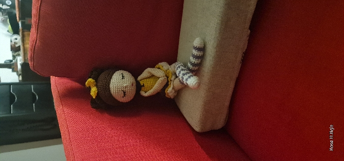 A crocheted monkey doll rests on a red couch, partially supported by a beige cushion. The doll has a brown head with yellow hair and a cream-colored face. A crocheted banana is near its body. The monkey's tail is light gray and white striped. The scene is well-lit, showcasing the textures of the crocheted doll and the couch fabric.
