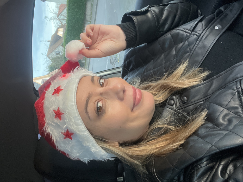 A woman wearing a Christmas hat with red stars and a pompom is sitting in a car
