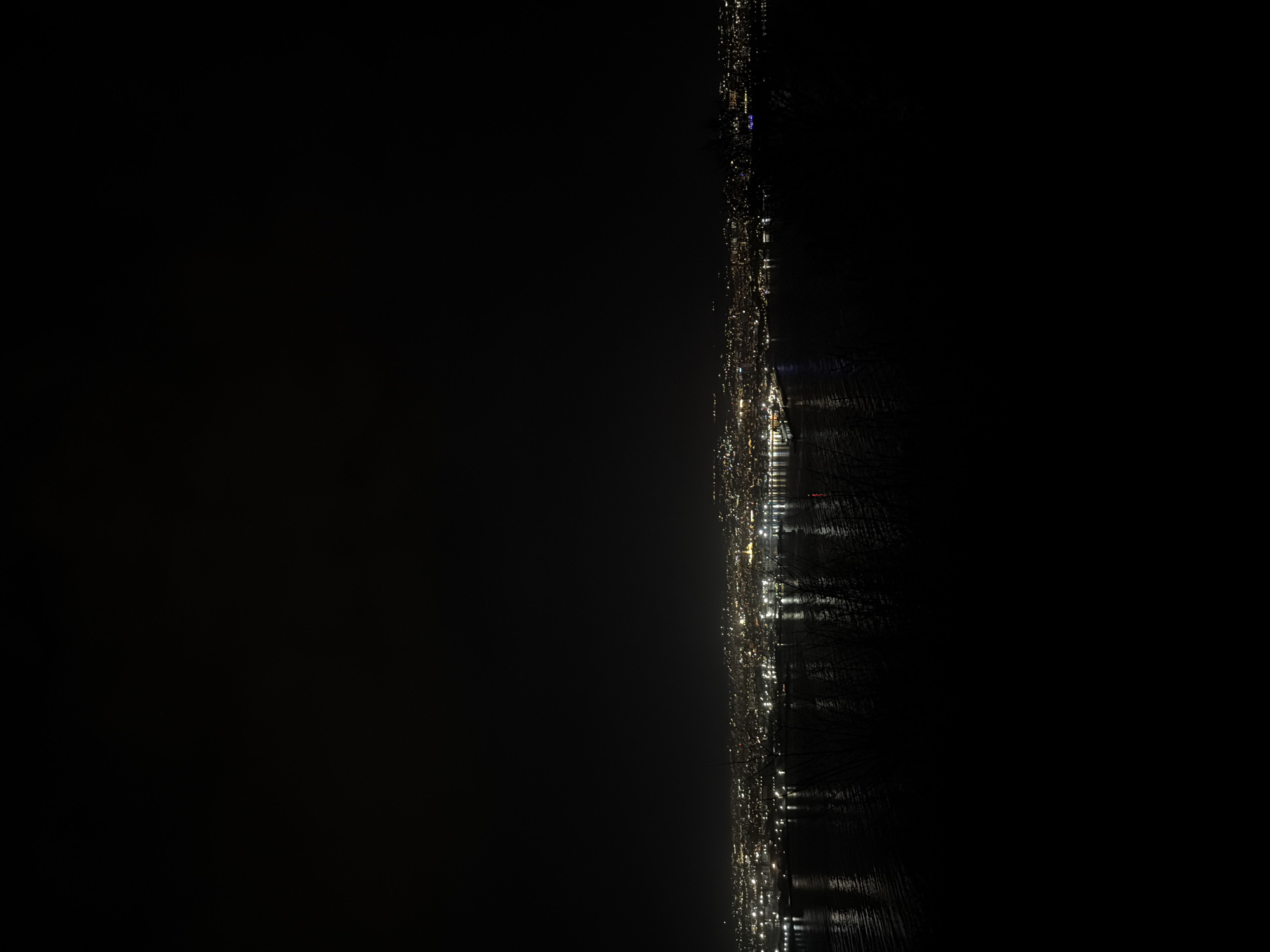 An elevated, wide-angle nighttime photograph depicts the illuminated cityscape of Varna, Bulgaria, situated along its namesake bay. The scene is dominated by a dark, clear sky occupying the upper half of the frame. In the midground, the reflective surface of Varna Bay (Black Sea) stretches horizontally, mirroring the myriad artificial lights of the city. The foreground presents indistinct, dark silhouettes of vegetation, likely bushes or trees, on a sloping incline, partially obscuring the immediate waterside. The city itself, concentrated from the mid-left to the mid-right, showcases a dense network of lights outlining streets, buildings, and infrastructure. Prominently positioned on an elevated section of the city, towards the right-center, is a large, distinctly illuminated structure with a golden glow, identifiable as the Dormition of the Theotokos Cathedral. To the left of the cathedral, along the waterfront, a cluster of brighter lights signifies the Varna Port area, likely including dock facilities and docked vessels. The urban sprawl extends up the hillsides surrounding the bay, with scattered lights indicating residential and commercial areas. No individuals, specific actions, or interactions are discernible within the frame. The overall environment is one of nocturnal urban illumination against a natural coastal backdrop.