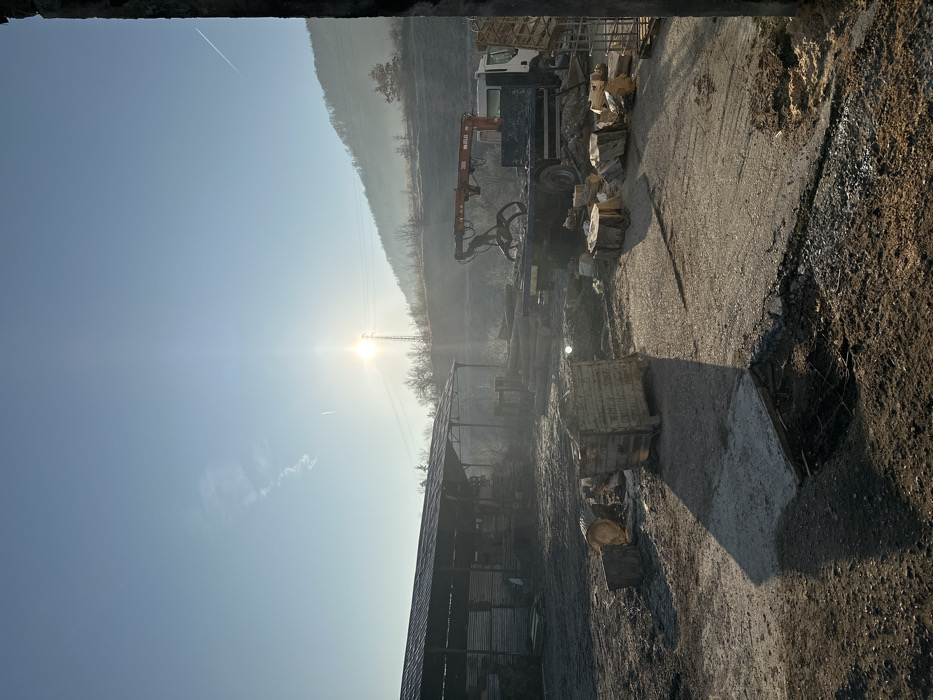 The scene depicts an outdoor industrial yard in Dobrodan, Bulgaria, under a clear, light blue sky with a low-angle sun, suggesting either early morning or late afternoon